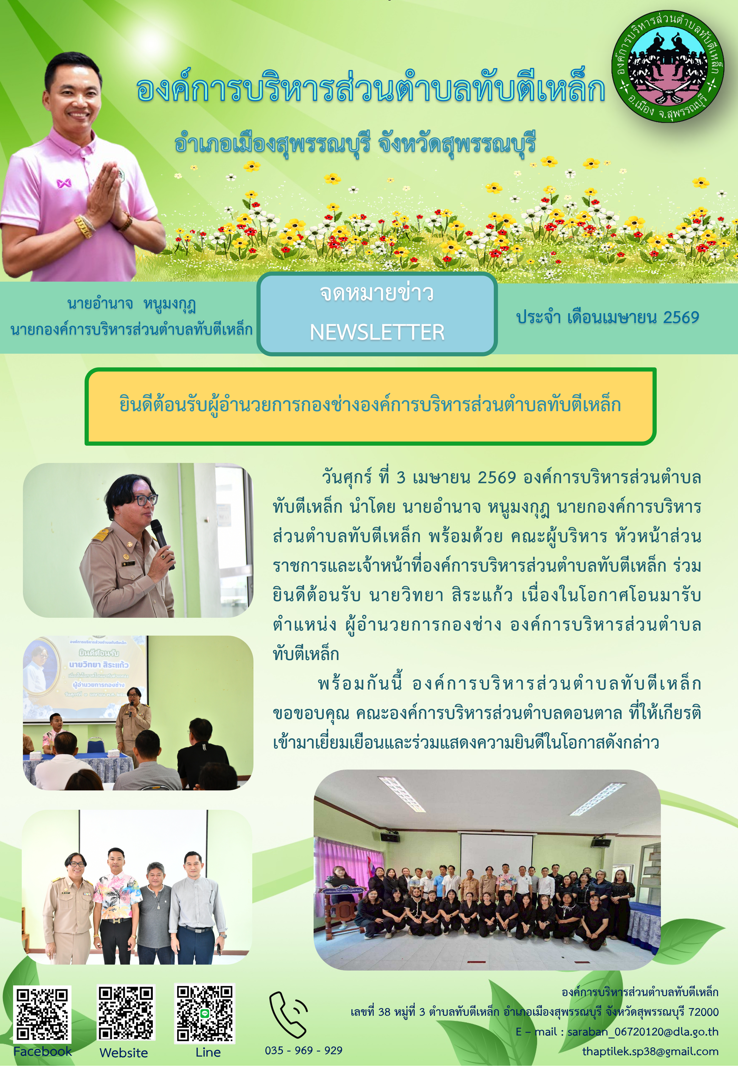 วันศุกร์ ที่ 3 เมษายน 2569 องค์การบริหารส่วนตำบลทับตีเหล็ก นำโดยนายอำนาจ หนูมงกุฎ นายกองค์การบริหารส่วนตำบลทับตีเหล็ก พร้อมด้วย คณะผู้บริหาร หัวหน้าส่วนราชการและเจ้าหน้าที่องค์การบริหารส่วนตำบลทับตีเหล็ก ร่วมยินดีต้อนรับ นายวิทยา สิระแก้ว เนื่องในโอกาศโอนมารับตำแหน่ง ผู้อำนวยการกองช่าง องค์การบริหารส่วนตำบลทับตีเหล็ก