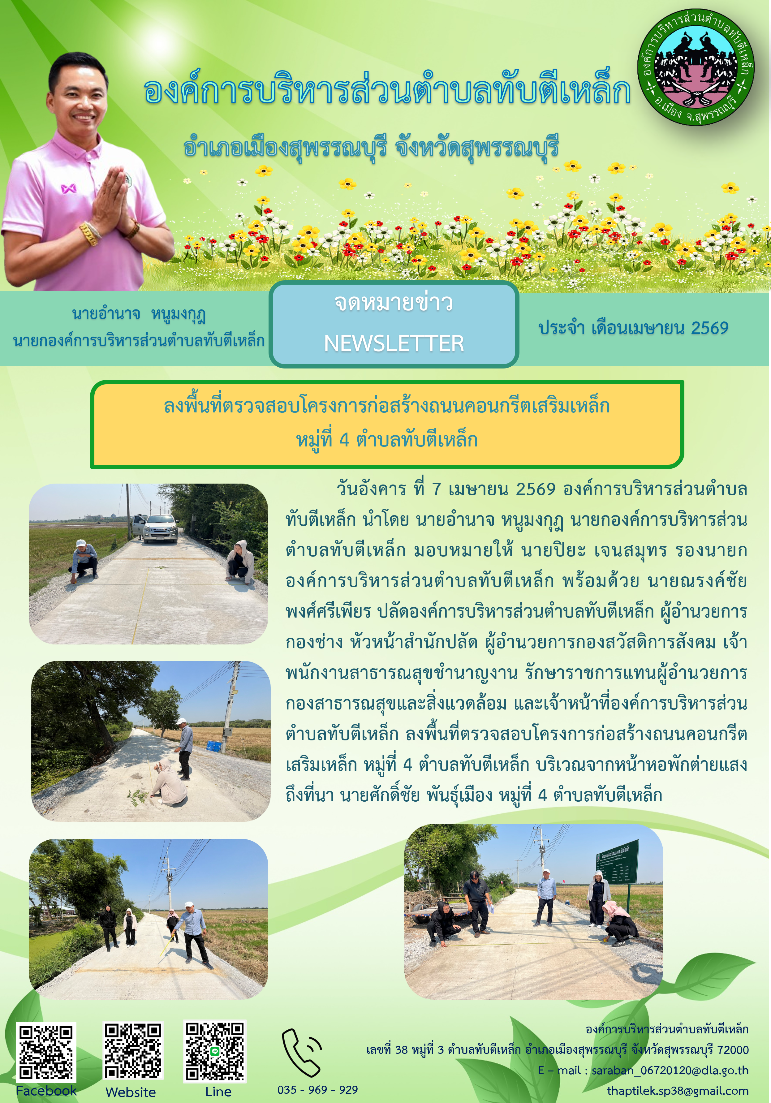 วันอังคาร ที่ 7 เมษายน 2569 องค์การบริหารส่วนตำบลทับตีเหล็ก นำโดย นายอำนาจ หนูมงกุฎ นายกองค์การบริหารส่วนตำบลทับตีเหล็ก มอบหมายให้ นายปิยะ เจนสมุทร รองนายกองค์การบริหารส่วนตำบลทับตีเหล็ก พร้อมด้วย นายณรงค์ชัย พงศ์ศรีเพียร ปลัดองค์การบริหารส่วนตำบลทับตีเหล็ก ผู้อำนวยการกองช่าง หัวหน้าสำนักปลัด ผู้อำนวยการกองสวัสดิการสังคม เจ้าพนักงานสาธารณสุขชำนาญงาน รักษาราชการแทนผู้อำนวยการกองสาธารณสุขและสิ่งแวดล้อม และเจ้าหน้าที่องค์การบริหารส่วนตำบลทับตีเหล็ก ลงพื้นที่ตรวจสอบโครงการก่อสร้างถนนคอนกรีตเสริมเหล็ก หมู่ที่ 4 ตำบลทับตีเหล็ก บริเวณจากหน้าหอพักต่ายแสง ถึงที่นา นายศักดิ์ชัย พันธุ์เมือง หมู่ที่ 4 ตำบลทับตีเหล็ก