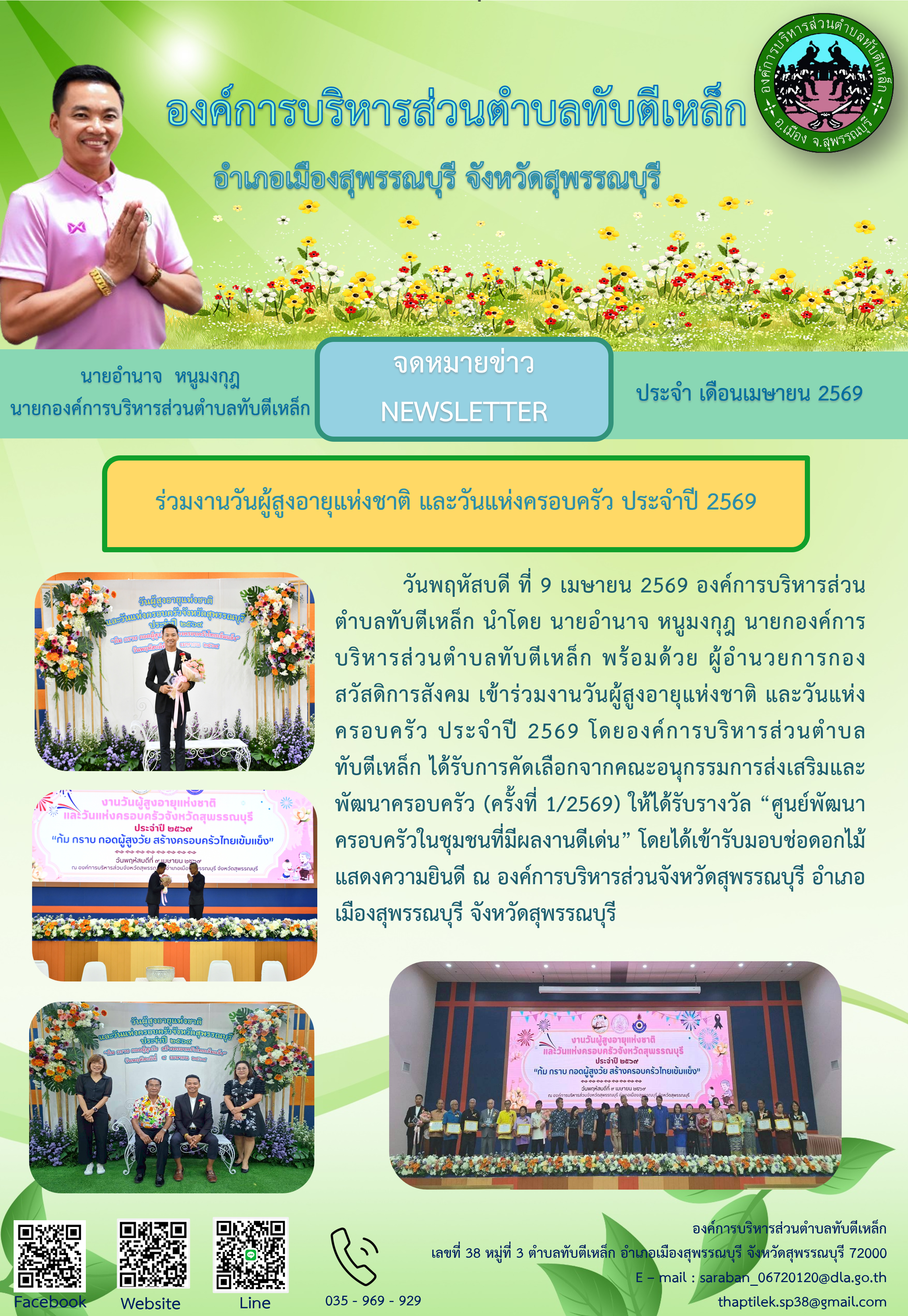 วันพฤหัสบดี ที่ 9 เมษายน 2569 องค์การบริหารส่วนตำบลทับตีเหล็ก นำโดย นายอำนาจ หนูมงกุฎ นายกองค์การบริหารส่วนตำบลทับตีเหล็ก พร้อมด้วย ผู้อำนวยการกองสวัสดิการสังคม เข้าร่วมงานวันผู้สูงอายุแห่งชาติ และวันแห่งครอบครัว ประจำปี 2569 โดยองค์การบริหารส่วนตำบลทับตีเหล็ก ได้รับการคัดเลือกจากคณะอนุกรรมการส่งเสริมและพัฒนาครอบครัว (ครั้งที่ 1/2569) ให้ได้รับรางวัล “ศูนย์พัฒนาครอบครัวในชุมชนที่มีผลงานดีเด่น” โดยได้เข้ารับมอบช่อดอกไม้แสดงความยินดี ณ องค์การบริหารส่วนจังหวัดสุพรรณบุรี อำเภอเมืองสุพรรณบุรี จังหวัดสุพรรณบุรี