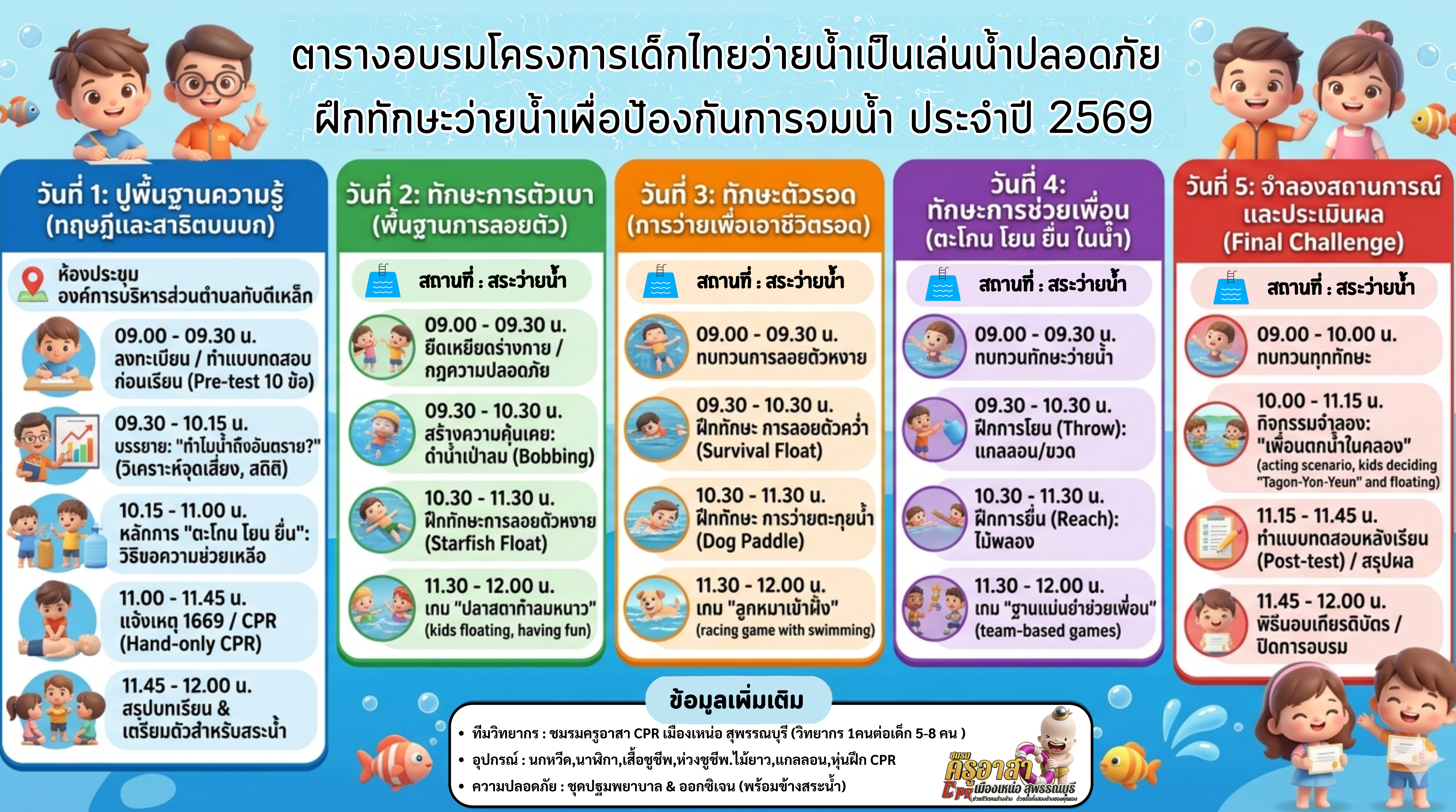 ประกาศรับสมัคร โครงการเด็กไทยว่ายน้ำเป็นเล่นน้ำปลอดภัย ฝึกทักษะว่ายน้ำเพื่อป้องกันการจมน้ำ ประจำปี 2569