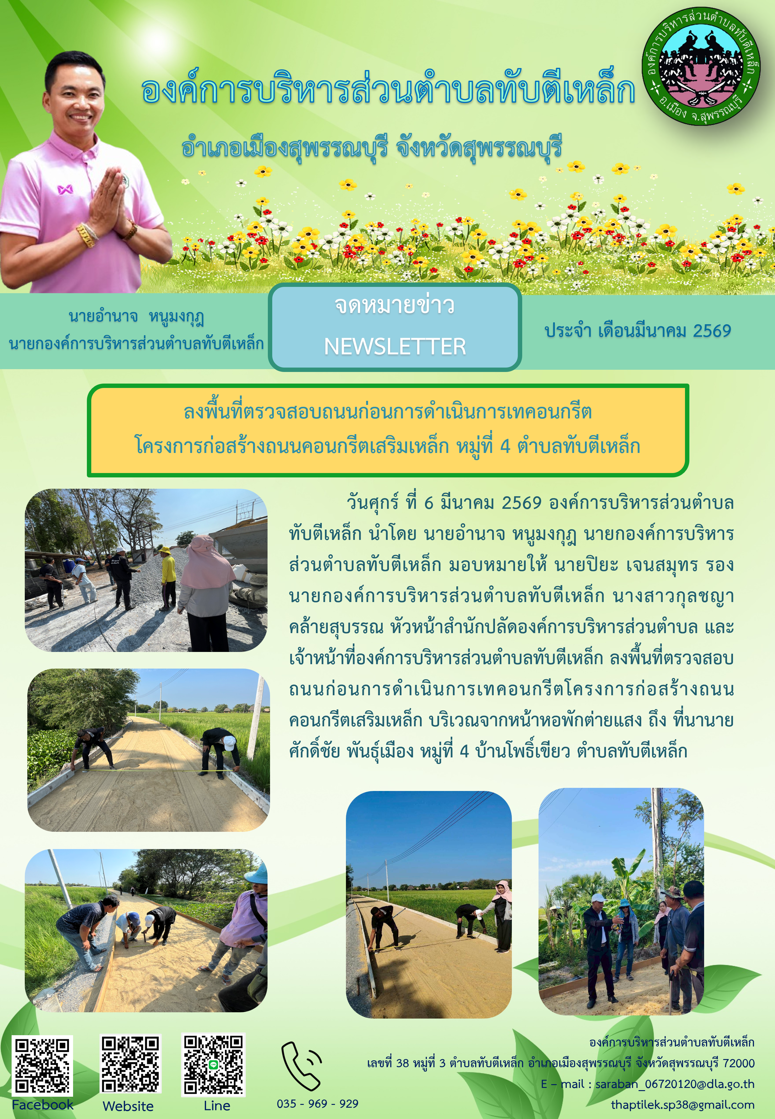 วันศุกร์ ที่ 6 มีนาคม 2569 องค์การบริหารส่วนตำบลทับตีเหล็ก นำโดย นายอำนาจ หนูมงกุฎ นายกองค์การบริหารส่วนตำบลทับตีเหล็ก มอบหมายให้ นายปิยะ เจนสมุทร รองนายกองค์การบริหารส่วนตำบลทับตีเหล็ก นางสาวกุลชญา คล้ายสุบรรณ หัวหน้าสำนักปลัดองค์การบริหารส่วนตำบล และเจ้าหน้าที่องค์การบริหารส่วนตำบลทับตีเหล็ก ลงพื้นที่ตรวจสอบถนนก่อนการดำเนินการเทคอนกรีตโครงการก่อสร้างถนนคอนกรีตเสริมเหล็ก บริเวณจากหน้าหอพักต่ายแสง ถึง ที่นานายศักดิ์ชัย พันธุ์เมือง หมู่ที่ 4 บ้านโพธิ์เขียว ตำบลทับตีเหล็ก