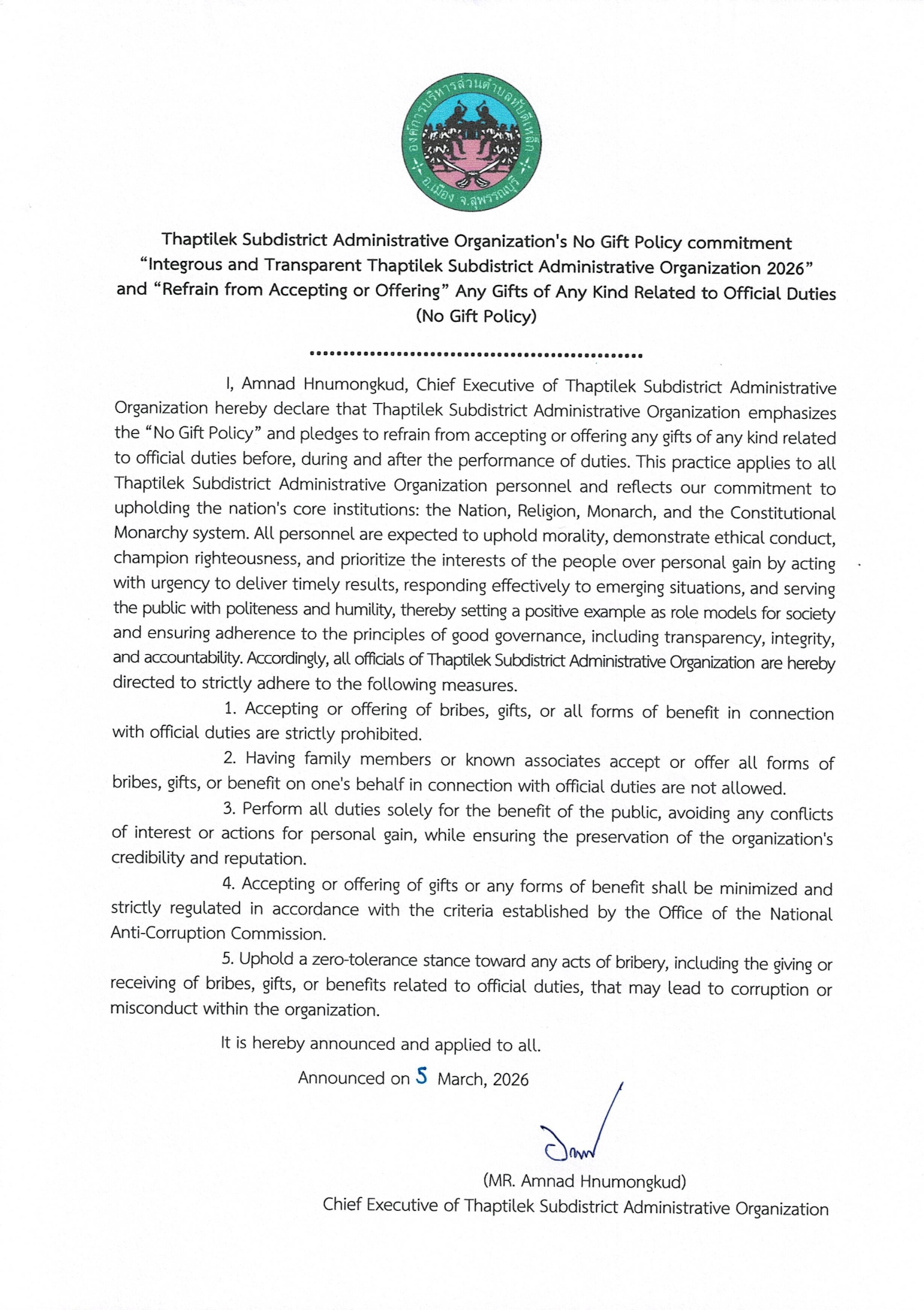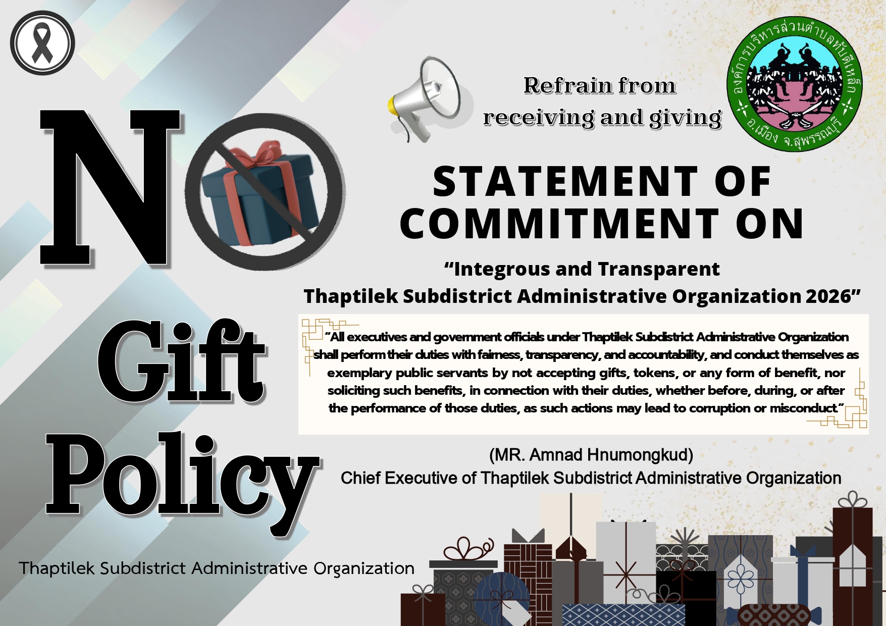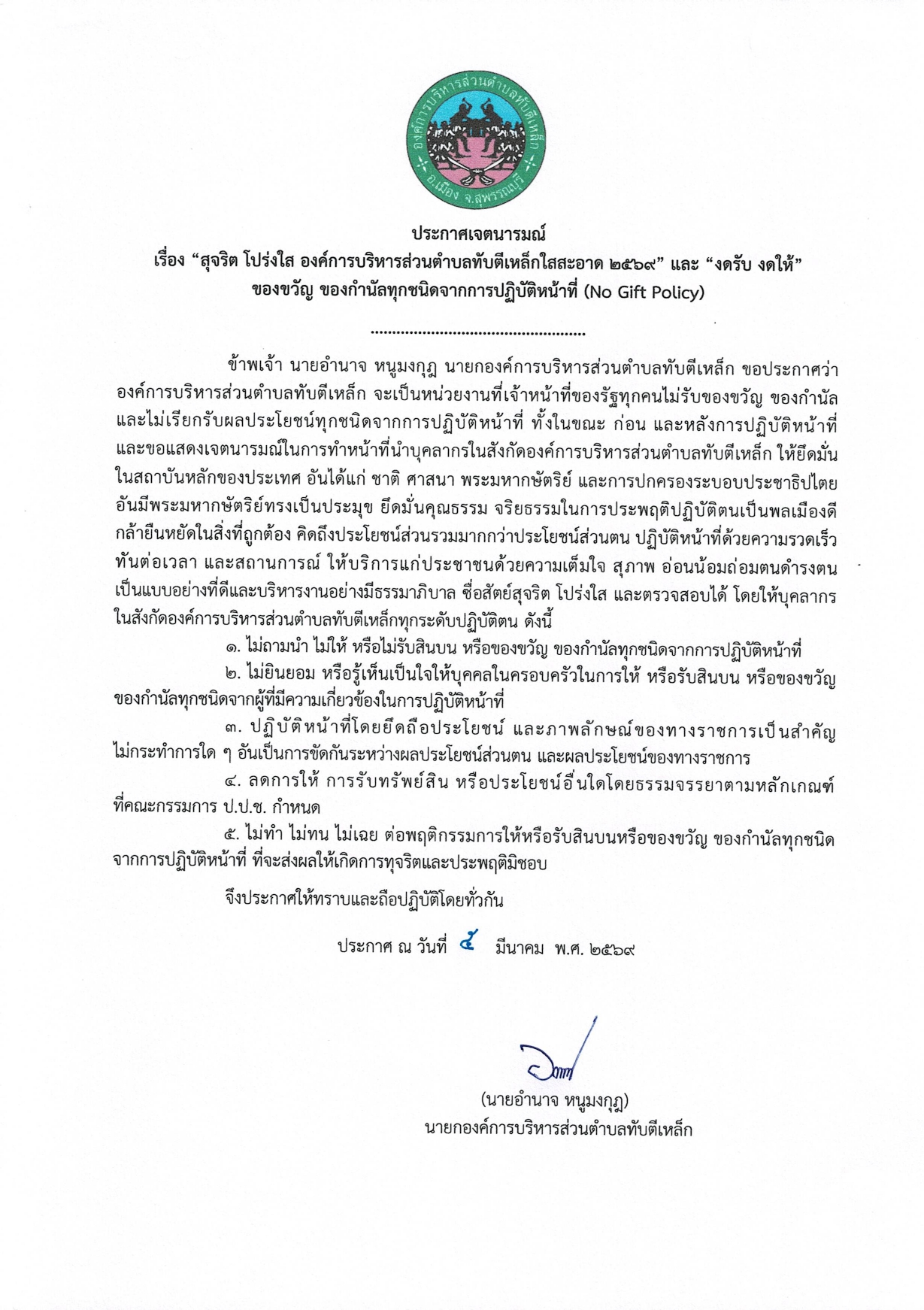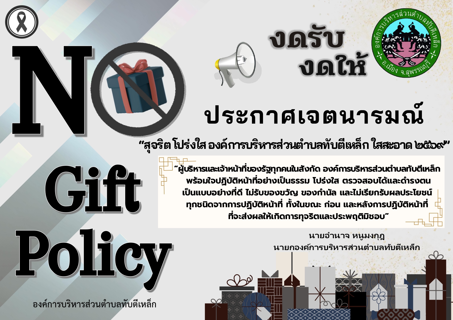 องค์การบริหารส่วนตำบลทับตีเหล็กดำเนินการประกาศเจตนารมณ์ “สุจริต โปร่งใส องค์การบริหารส่วนตำบลทับตีเหล็กใสสะอาด 2569” และ “งดรับ งดให้” ของขวัญ ของกำนัลทุกชนิดจากการปฏิบัติหน้าที่ (No Gift Policy)